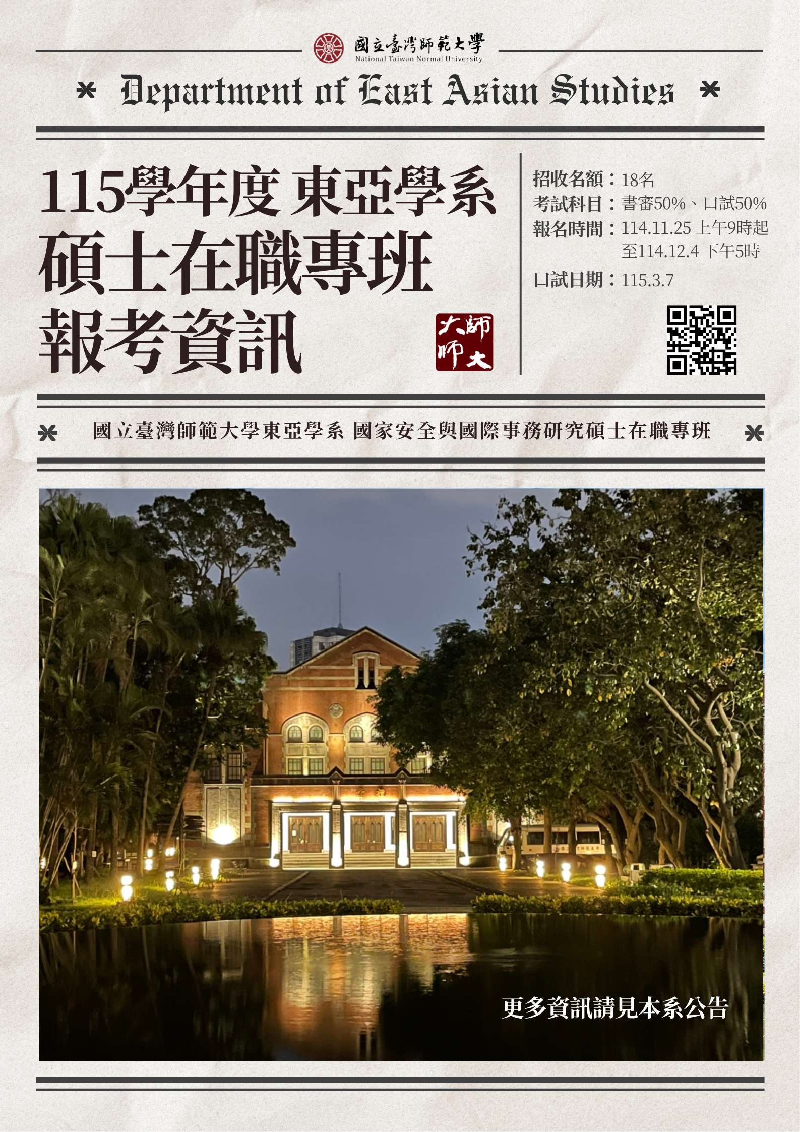 國立臺灣師範大學辦理東亞學系「國家安全與國際事務研究碩士在職專班」115學年度招生