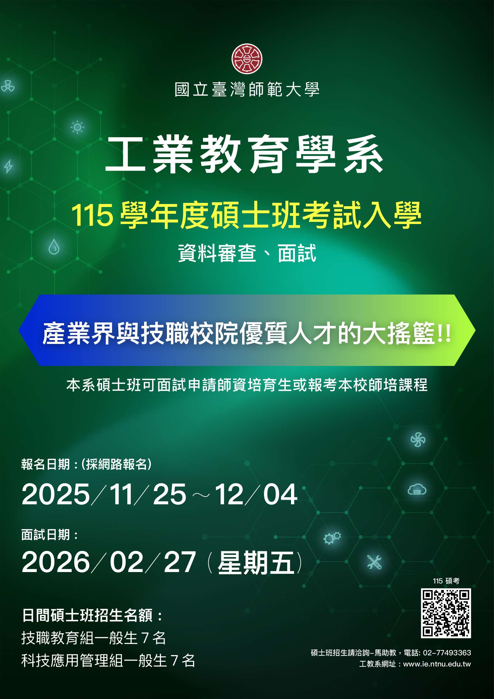 國立臺灣師範大學辦理工業教育學系「115學年度碩士班、碩士在職專班」招生