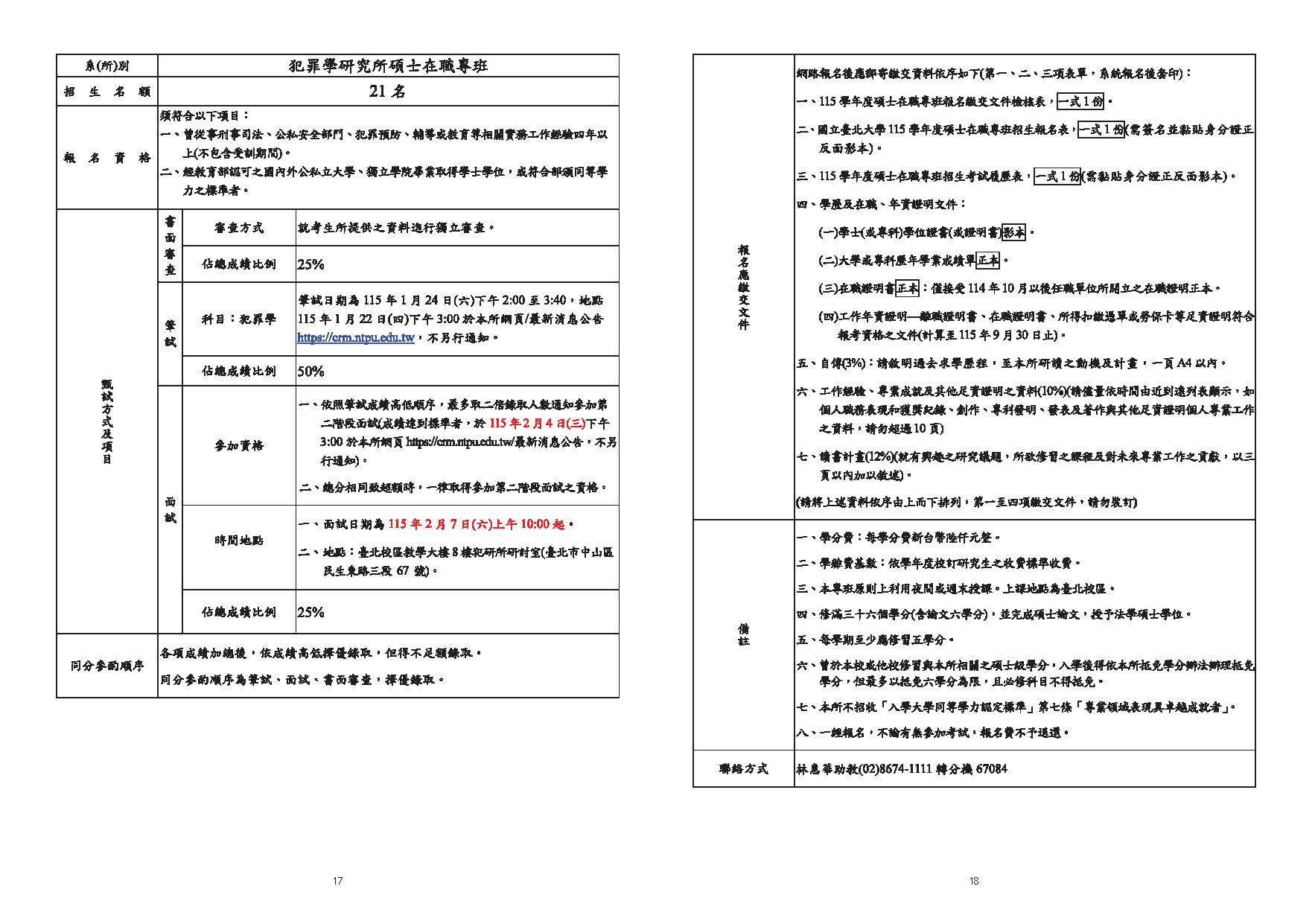 國立臺北大學辦理犯罪學研究所115學年度碩士在職專班招生