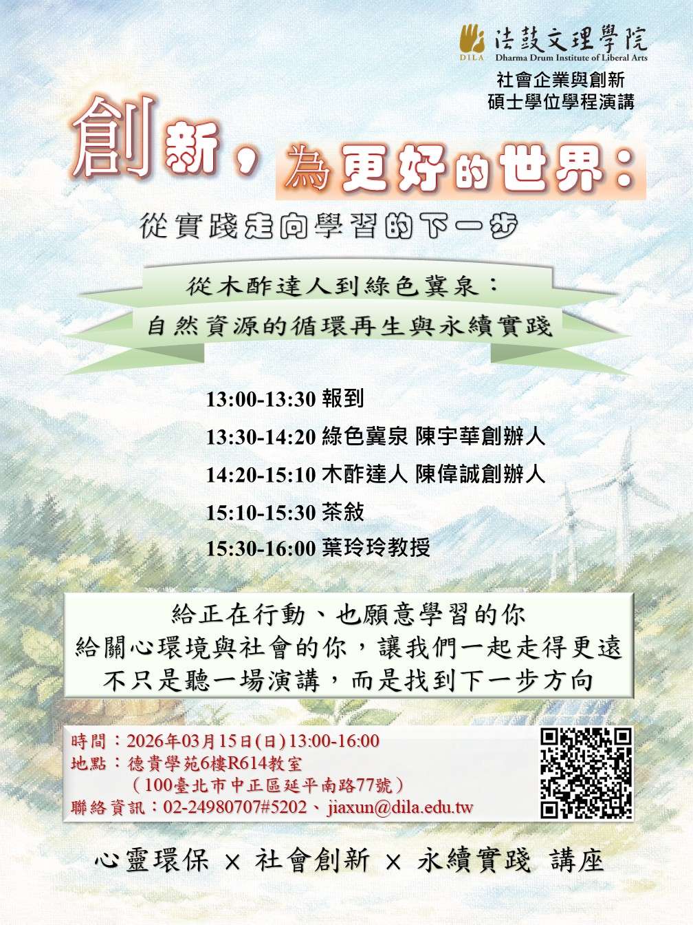 【轉知】法鼓學校財團法人法鼓文理學院115學年度「社會企業與創新碩士學位學程」招生暨演講活動資訊。