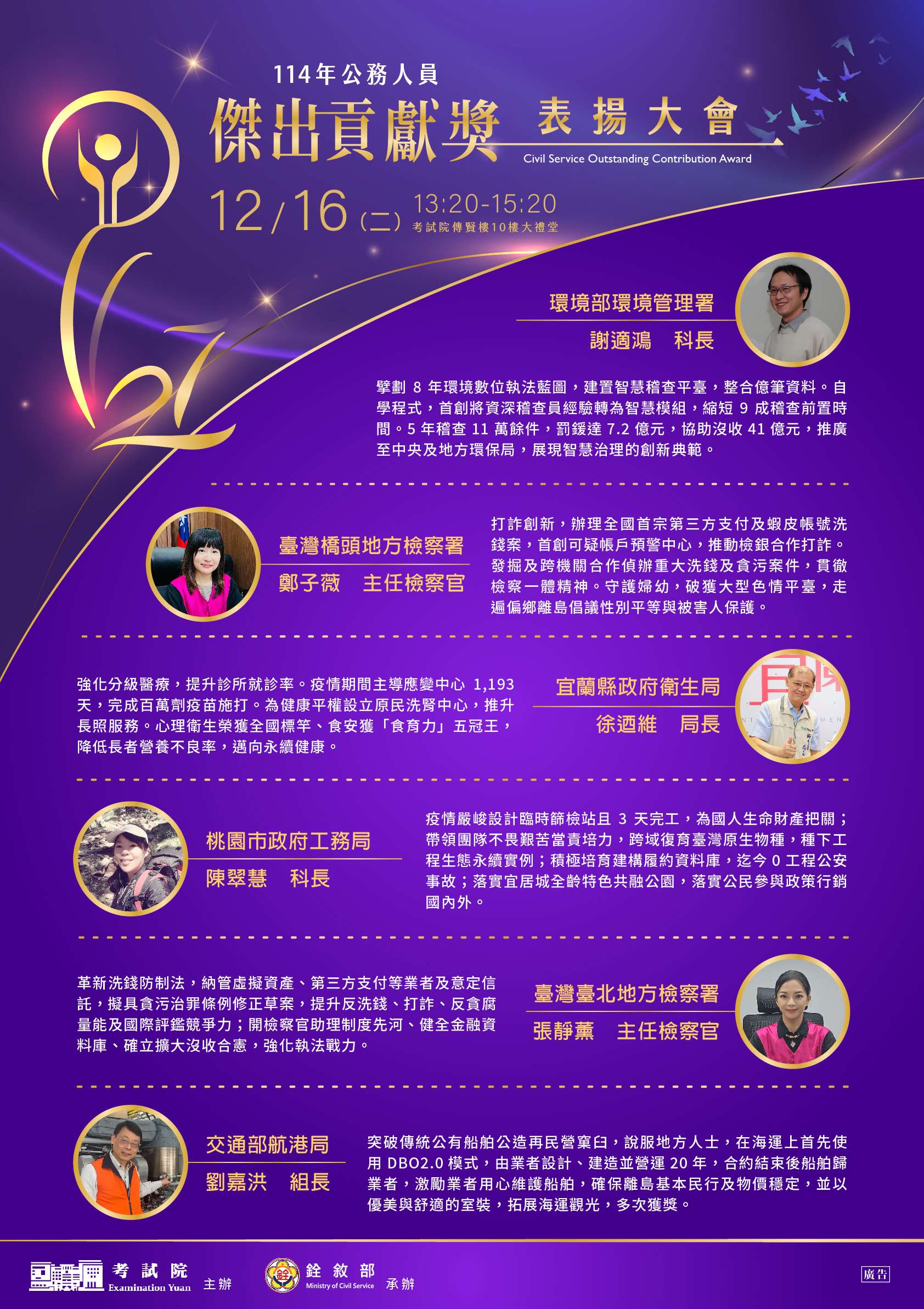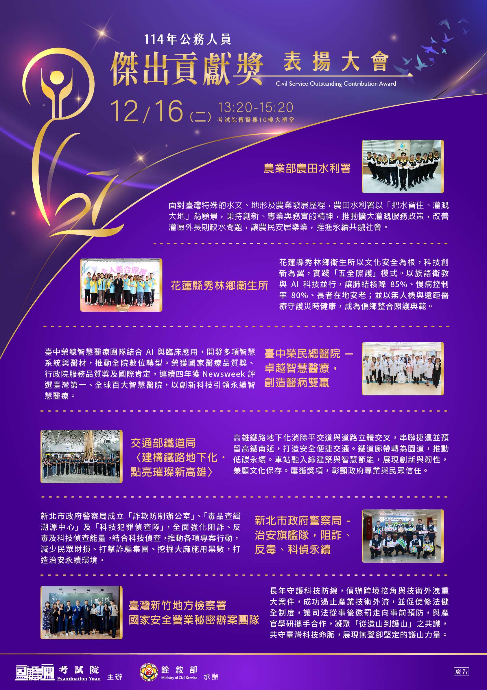 公告「114年公務人員傑出貢獻獎表揚大會」電子海報一案,請參閱附件。