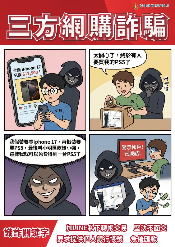 三、近期發現詐騙集團常用「網路購物詐騙」、「三方詐騙」 等方式,誘導民眾匯款或轉帳、淪為警示帳戶,為避免詐 騙集團藉以行騙,爰彙整宣導圖文素材及影片。