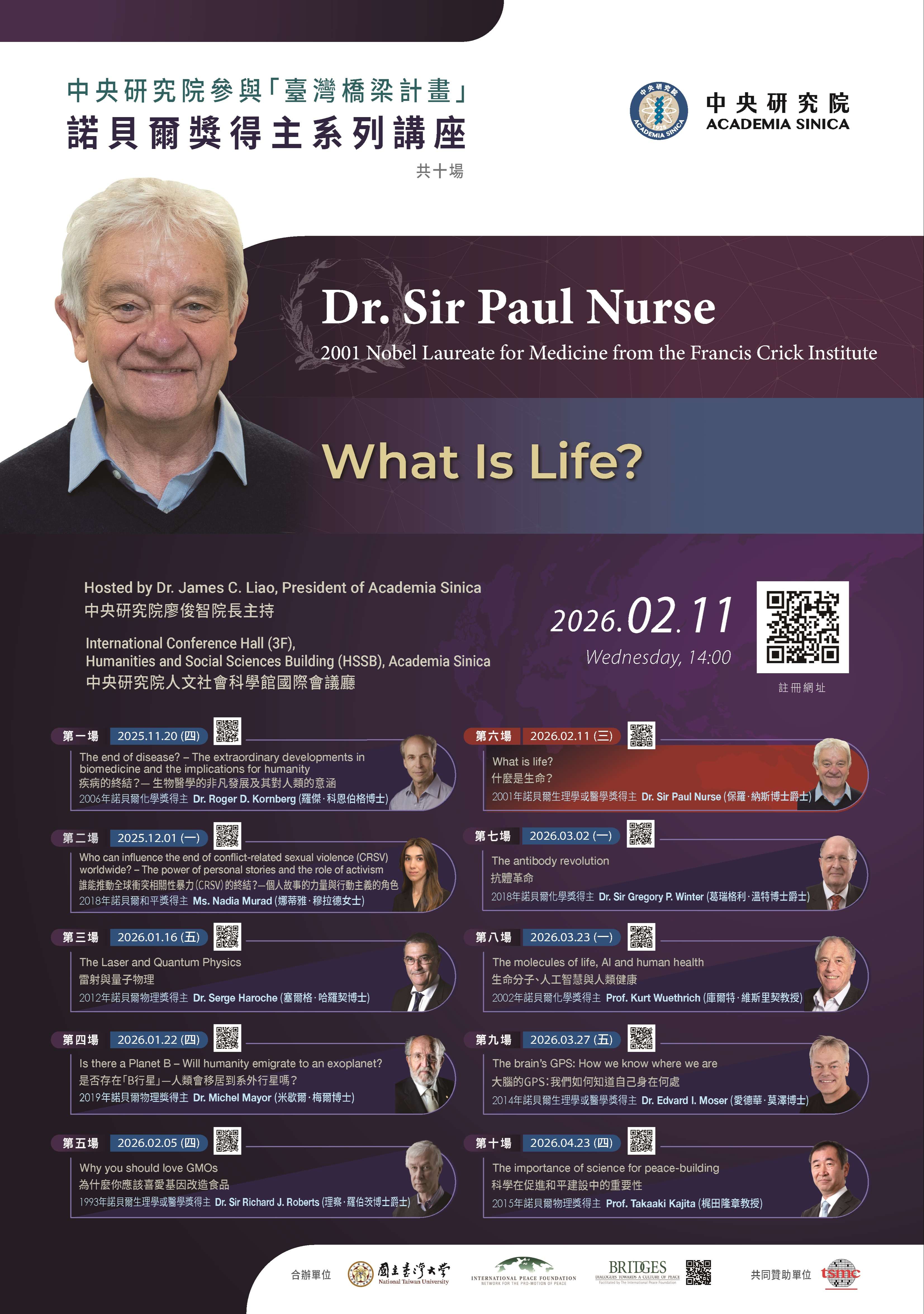 一、「臺灣橋梁計畫」自114年11月起至本(115)年4月,共將邀請 31 位諾貝爾獎得主訪問本院及全臺十餘所大學,相關資訊請參閱網站:https://www.peace-bridges.net/。