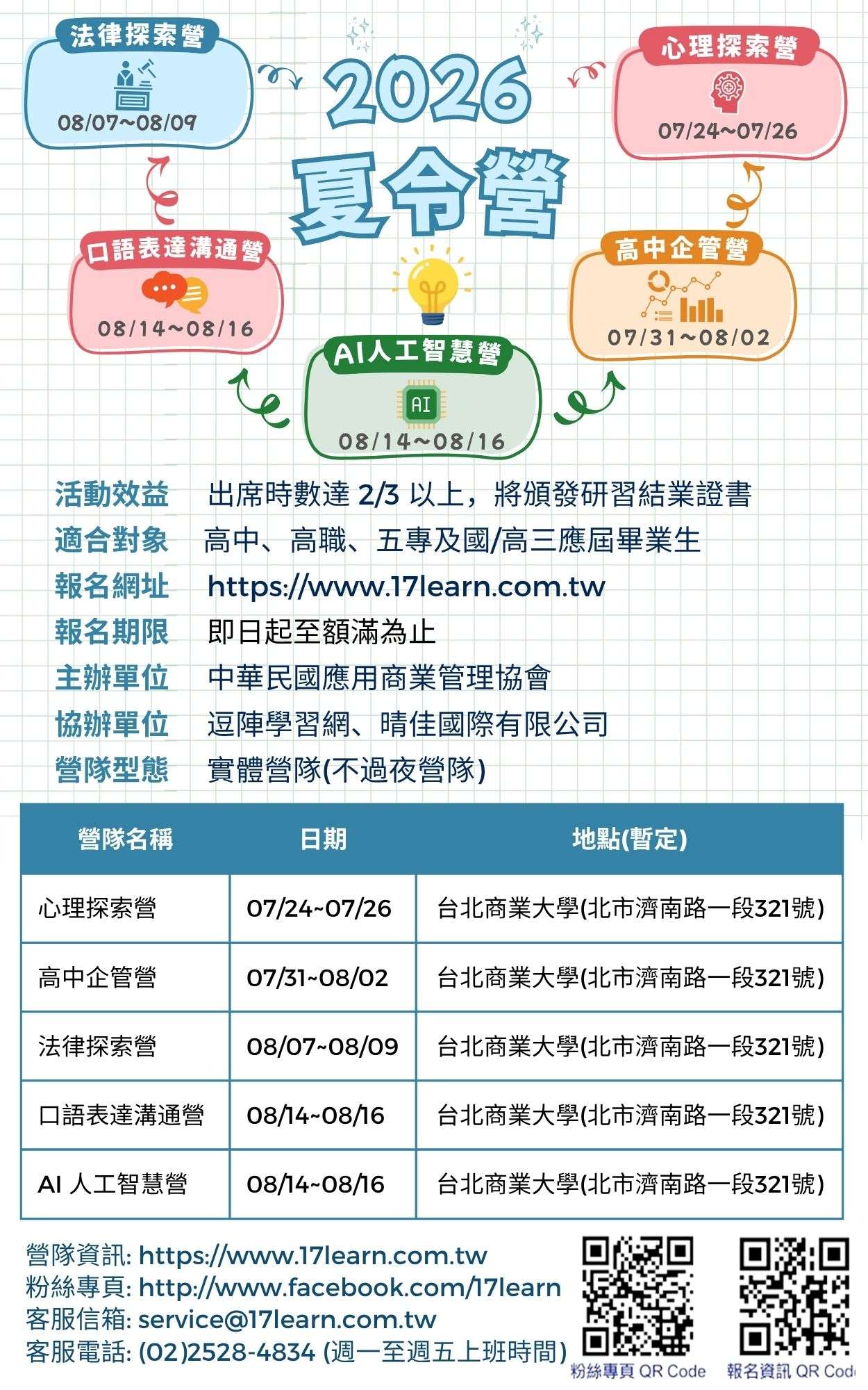 二、營隊名稱:「心理探索營」、「高中企管營」、「口語表達溝通營」、「法律探索營」、「AI人工智慧營」。