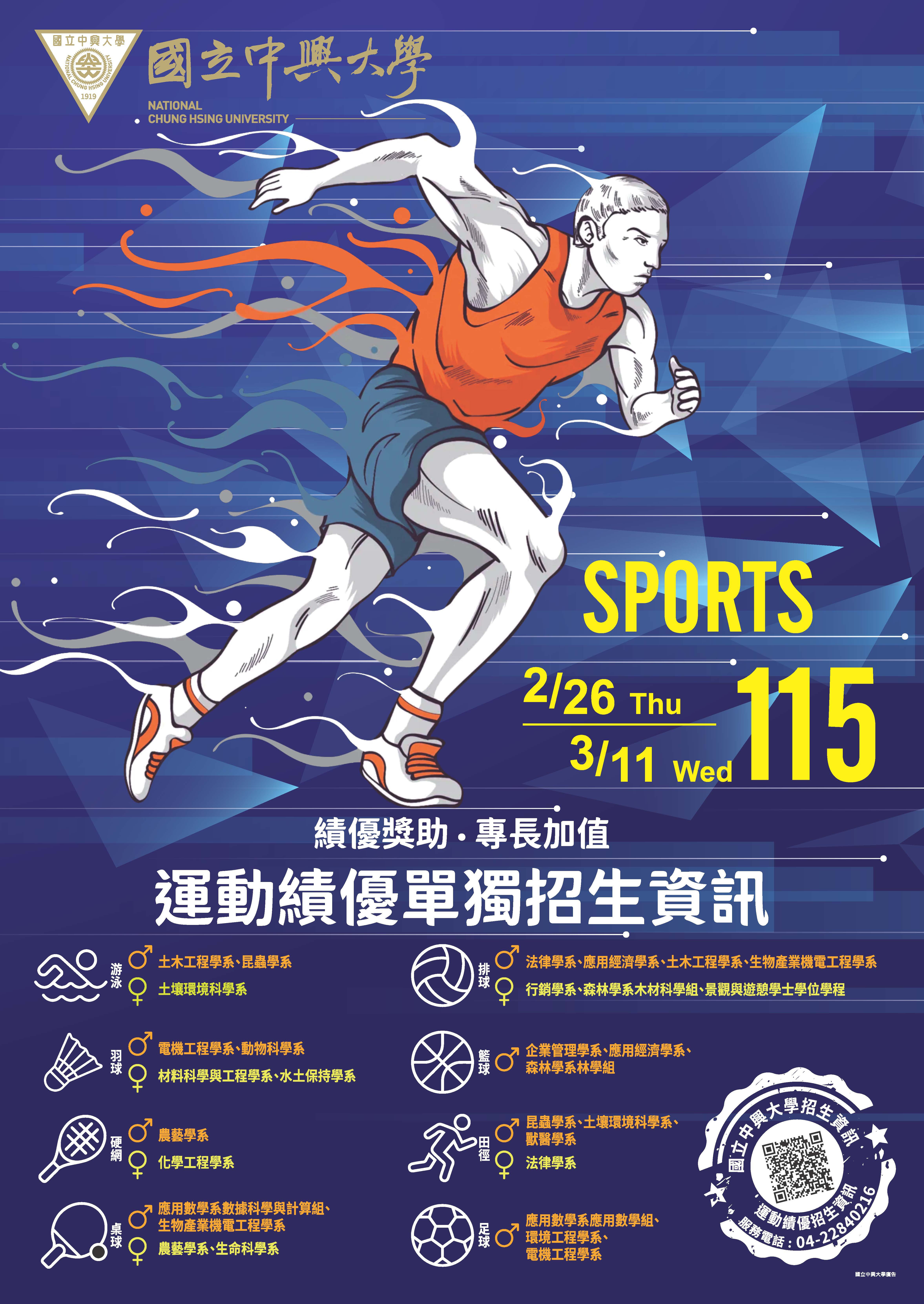 (三)報名網址為:https://recruit.nchu.edu.tw/。招生簡章開放下載https://recruit.nchu.edu.tw/college-exam/sport/115/115Sports_PAPER.aspx。