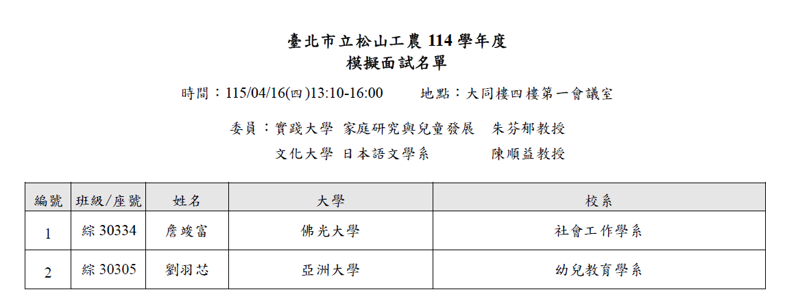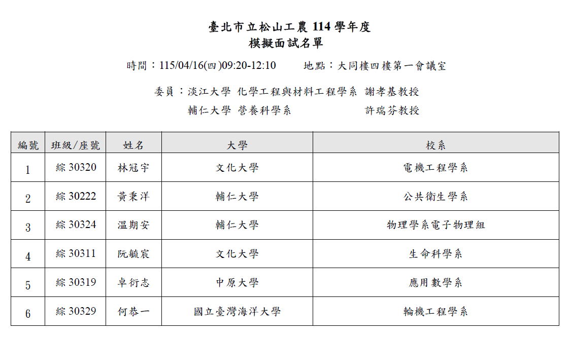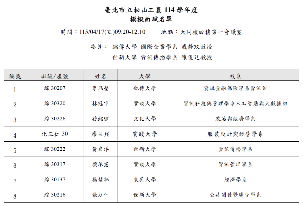 熱騰騰的模擬面試名單及次序出爐囉!明天04/16(四)上下午及04/17(五)上午,皆有舉辦模擬面試,屆時將會依簽到來進行公假,以下為面試注意事項: