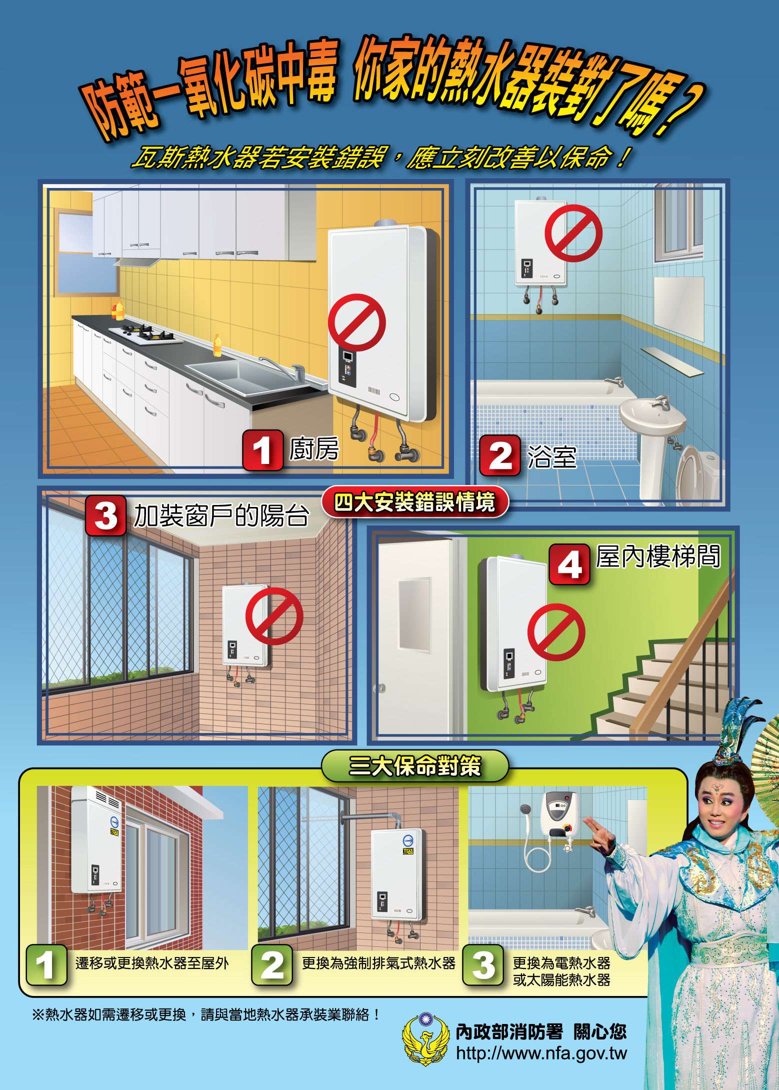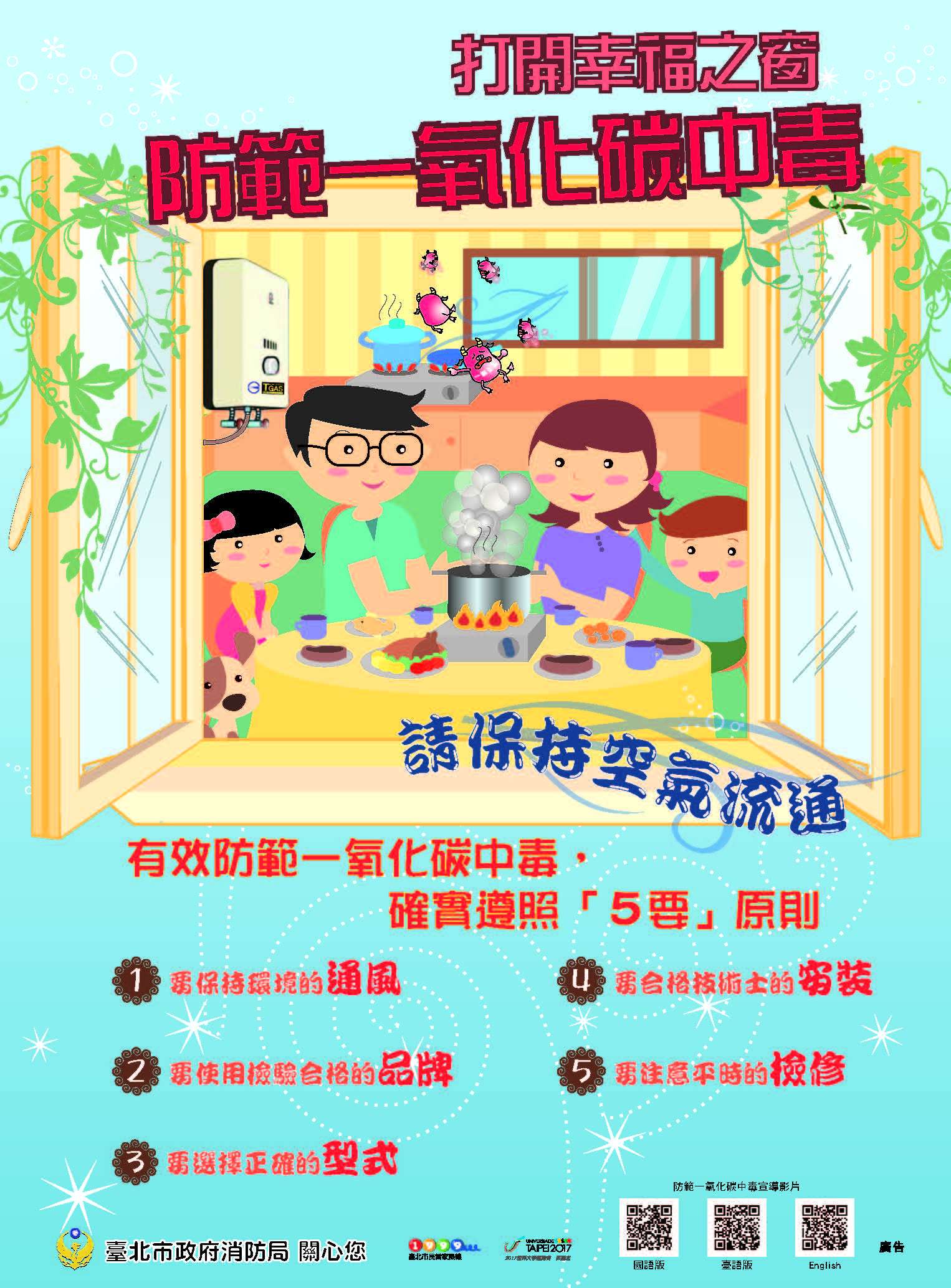 4、正確安裝熱水器,通風安全要注意;居家用火通風好,一氧化碳不來擾。