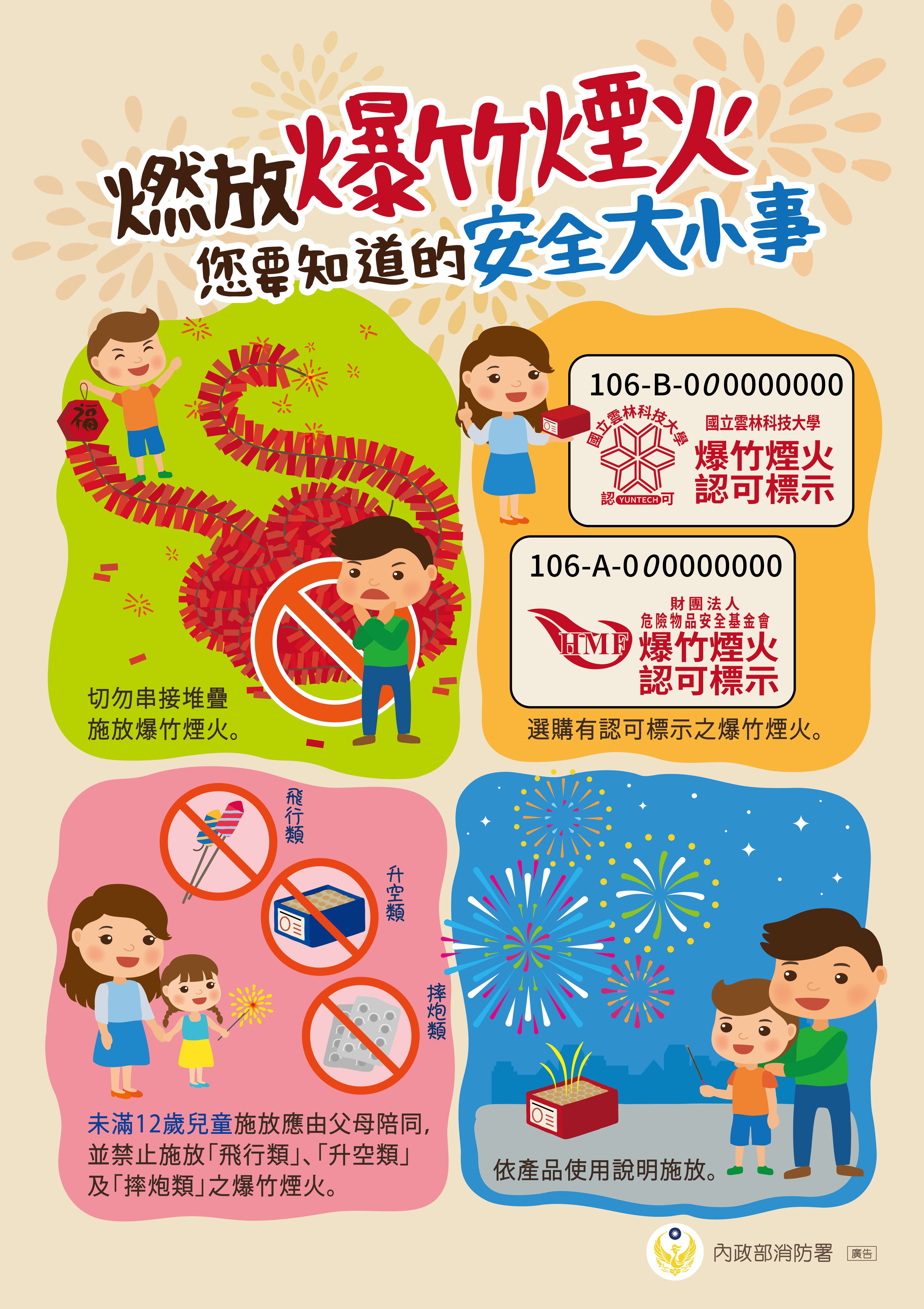 6、爆竹煙火危險多,合格標識細辨認,小心使用免災禍,平安快樂闔家歡。