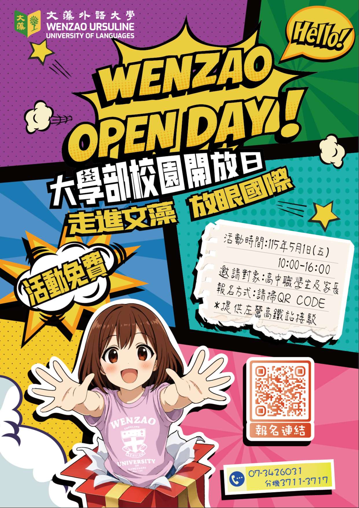 【轉知】文藻學校財團法人文藻外語大學115年大學部校園開放日活動海報。