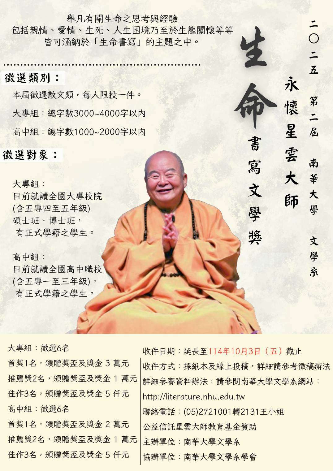 南華大學 「2025第二屆永懷星雲大師——生命書寫文學獎」活動延長徵稿至114年10月3日。