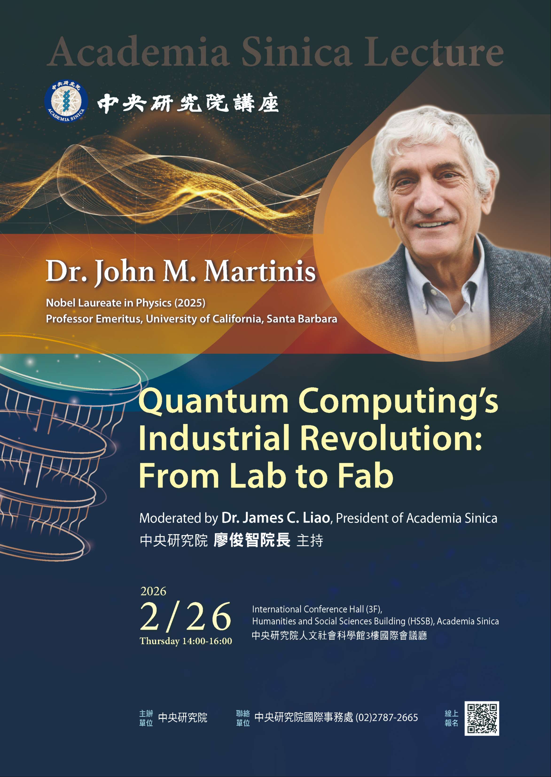 一、「中央研究院講座」係本院最高榮譽講座,本次特邀2025年諾貝爾物理學獎得主約翰.馬汀尼斯博士以「量子運算的產業轉型:從科研邁向產業」為題演講。