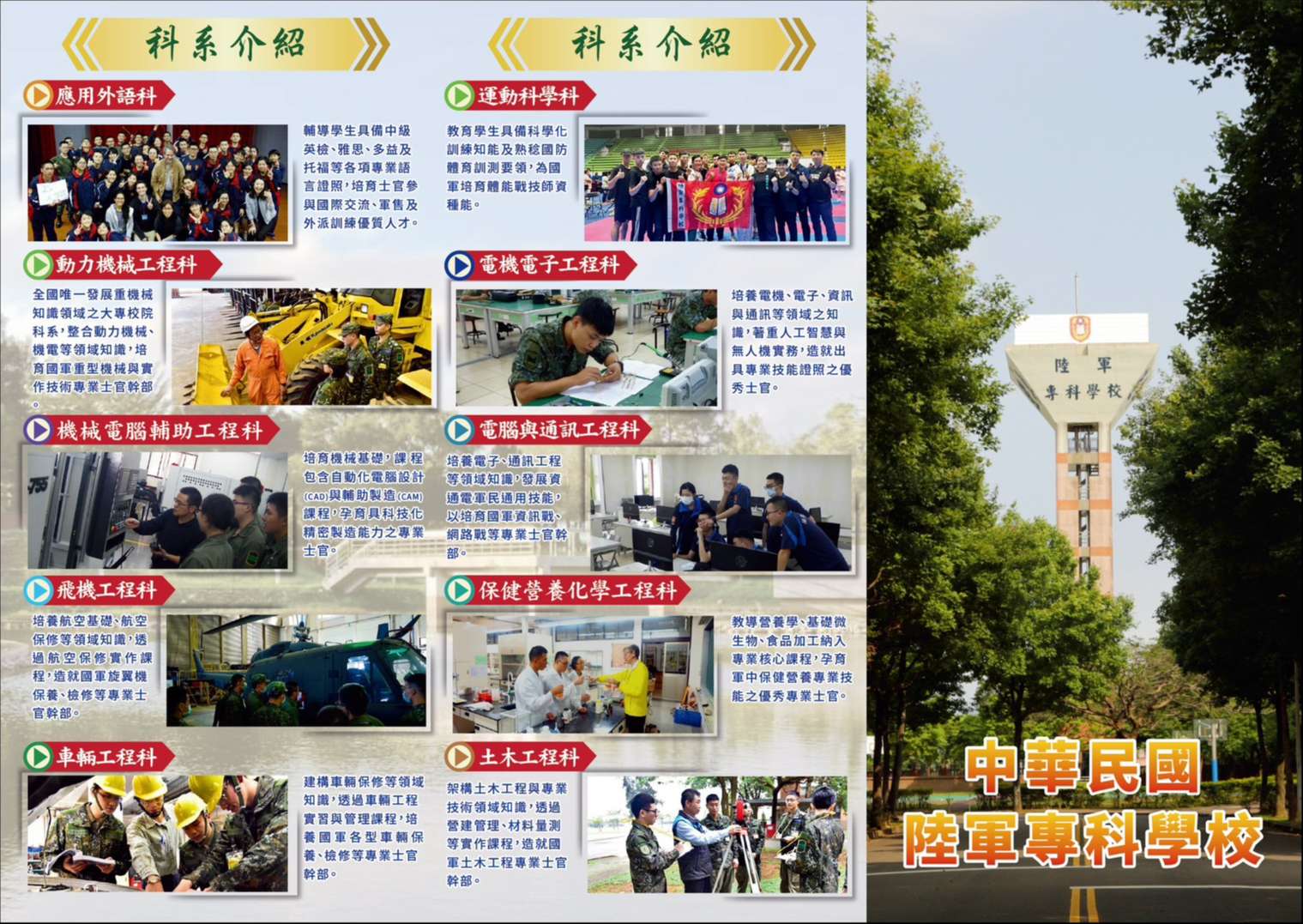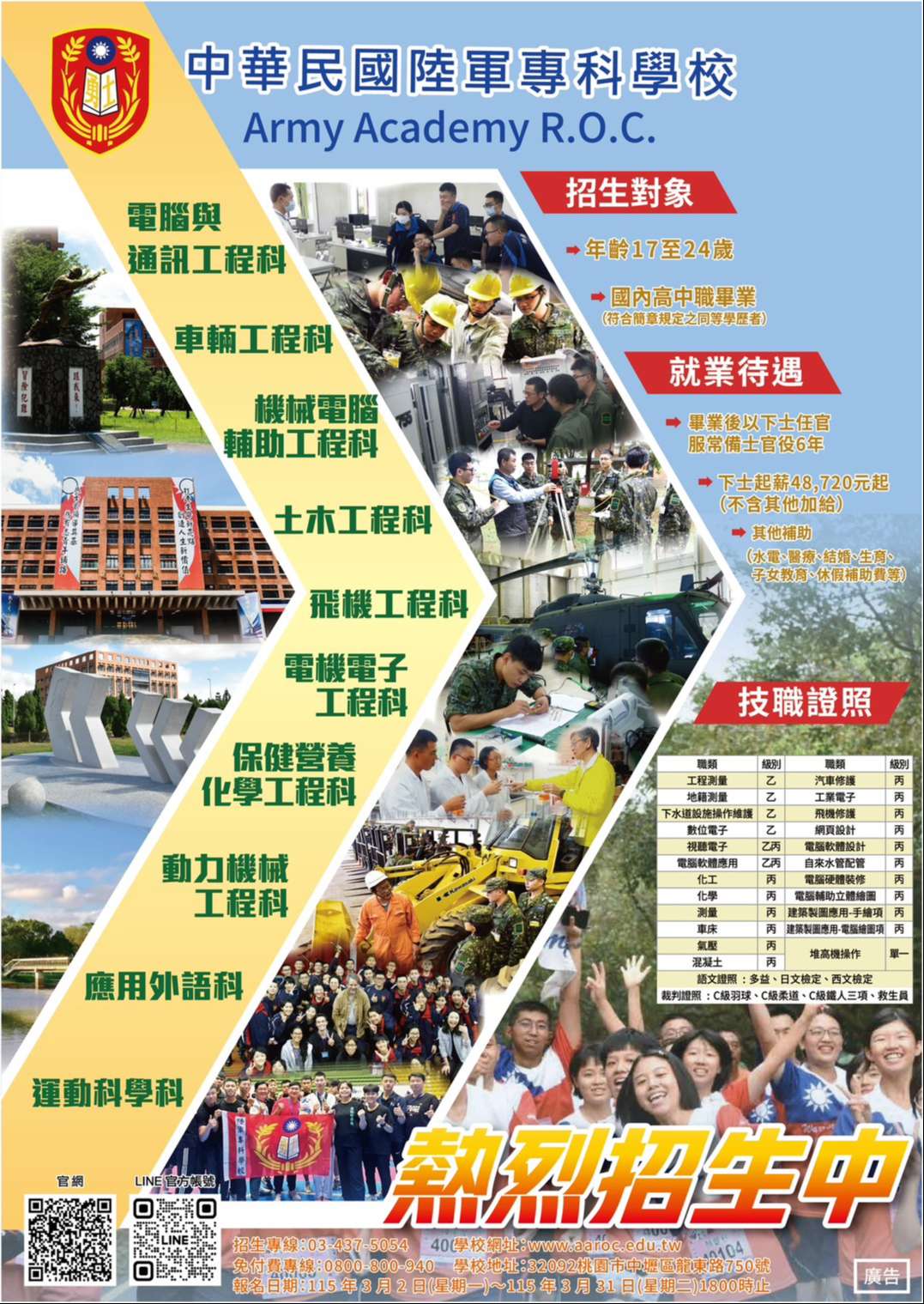 二、為落實全民國防教育政策,協助青年學子認識國軍專業教 育體系與多元科系,提早規劃生涯發展方向,並拓展學生 升學與穩定就業選擇,特函轉陸軍專科學校招生資訊。軍 事校院招生資訊之充分揭露,亦屬學生升學資訊知情權與 多元進路選擇之重要一環,學校在協助學生瞭解各項升學 管道方面扮演關鍵角色,敬請貴校惠予協助公告與宣導, 俾利學生及家長參考運用。