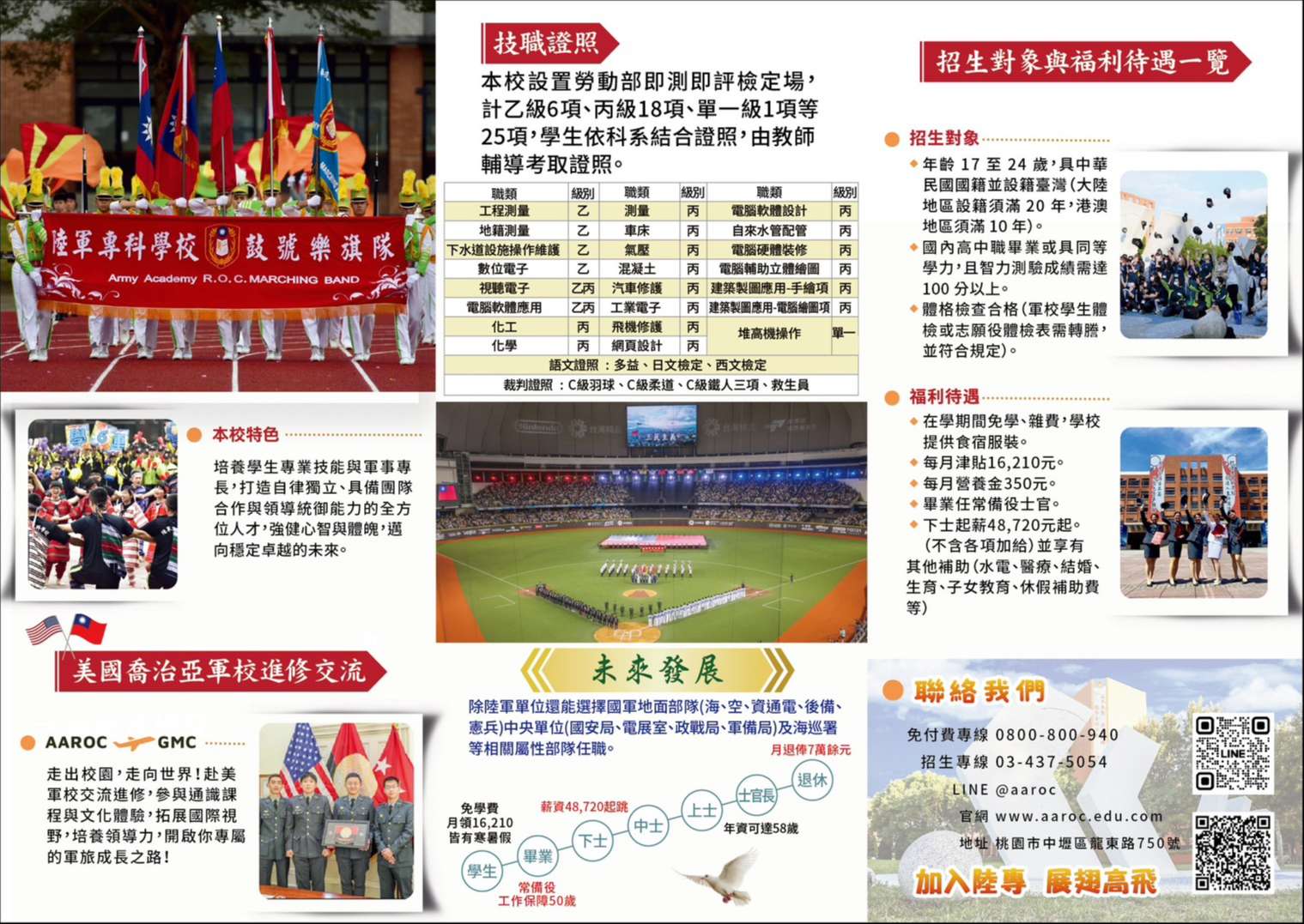 四、為利學生即時掌握最新招生資訊與校園動態,相關官方資 訊管道如下 (一)陸軍專科學校官網:https://www.aaroc.edu.tw /home。 (二)臉書粉專:https://www.facebook.com /aarocAdmissions。 (三)IG連結:https://www.instagram.com/aaroc2020/。