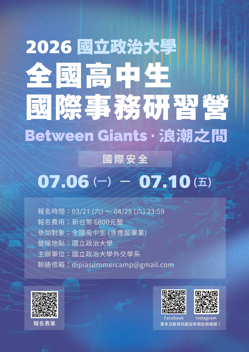 三、檢送活動海報電子檔,可自行影印使用,敬請惠予協助宣傳並鼓勵學生踴躍參加。相關活動資訊請上活動頁面查詢:https://www.instagram.com/nccudip_iasc?igsh=NmhseXgxdGRjbTFo&utm_source=qr,或IG搜尋「2026政大外交國際事務研習營」。https://www.facebook.com/share/1Aoi7ajNSf/?mibextid=wwXIfr或FB搜尋「全國高中生國際事務研習營」。