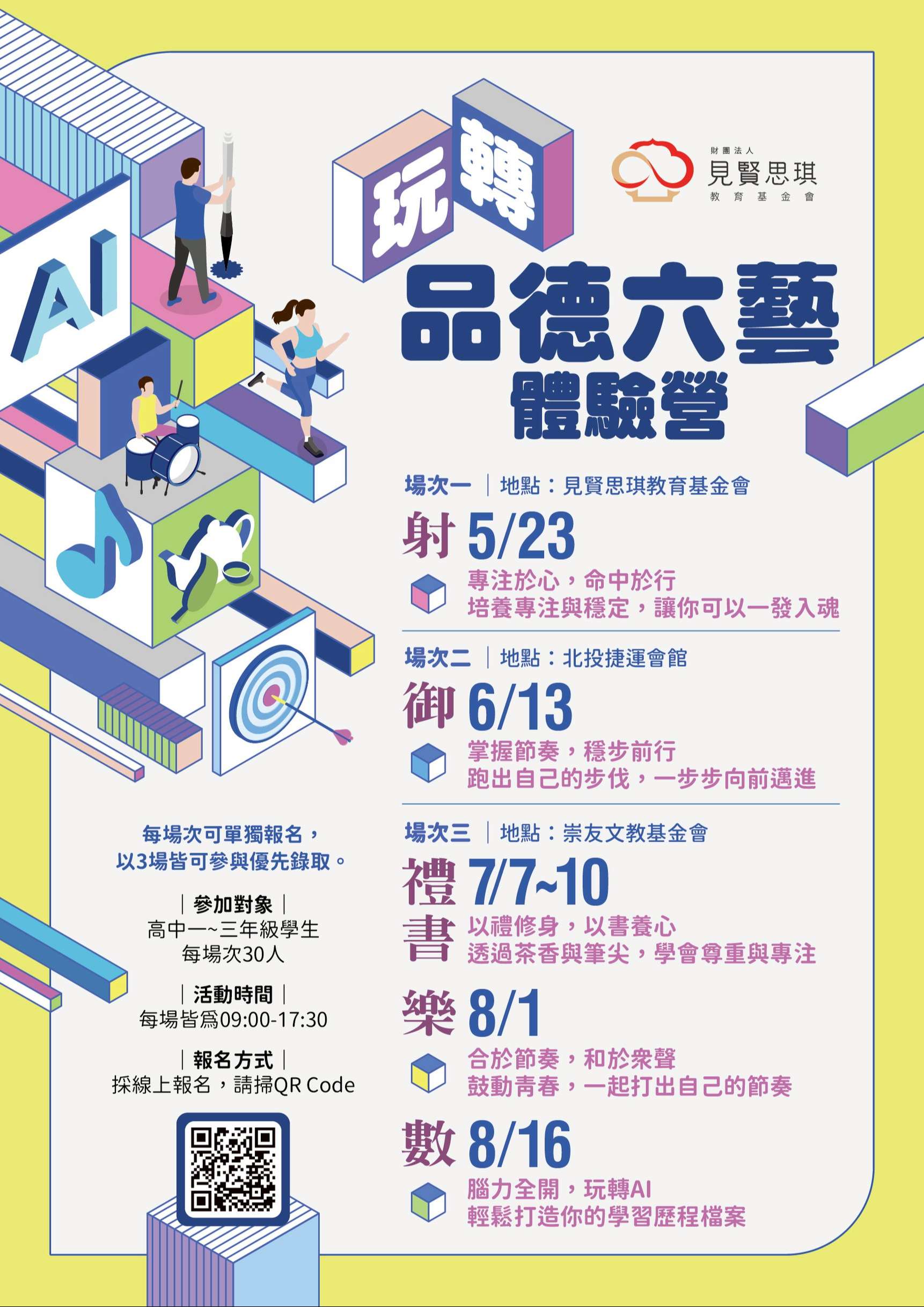 一、為推動品德教育向下扎根,本會以孔子「六藝」(禮、樂、射、御、書、數)為核心理念,將品德結合六藝實作體驗課程,培養青少年全人品德素養與發展。