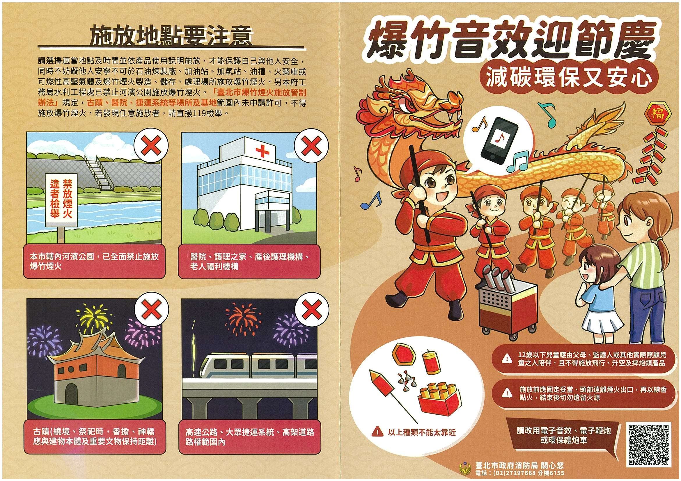 四、「臺北市爆竹煙火施放管制辦法」已規範高速公路、大眾捷運系統及高架道路路權範圍內、古蹟、醫院、護理之家、產後護理機構及老人福利機構等場所及基地範圍內,不得施放爆竹煙火,請以電子鞭炮或爆竹音效替代傳統爆竹燃放,爆竹燃放音效可至本市消防局網站 https://reurl.cc/LpX1N7下載使用。